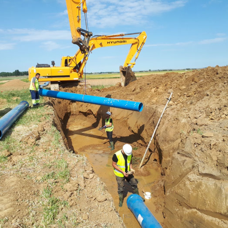 Red de distribución ramificada de la Zona de Impulsión de 8.190,2 m de longitud y diámetros comprendidos entre 400 mm y 90 mm, en PVC-O serie 500 y PEAD (PE-100). Red de distribución de la Zona de Gravedad de 21.778,35 m de longitud y diámetros desde 800 mm a 90 mm, con los siguientes materiales: PVC-O serie 500 y PEAD (PE-100).